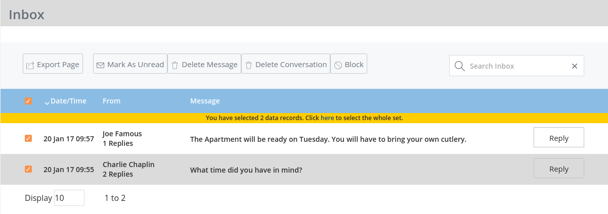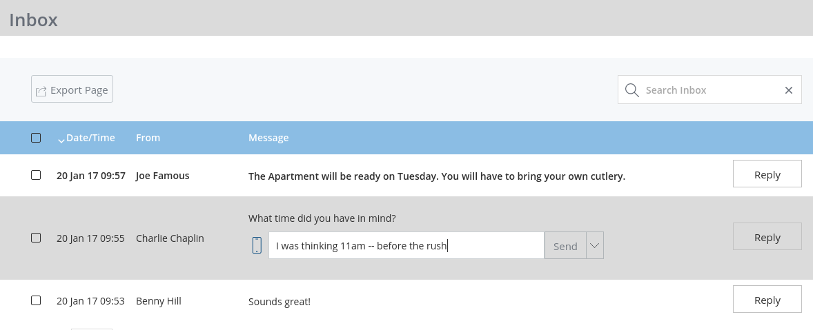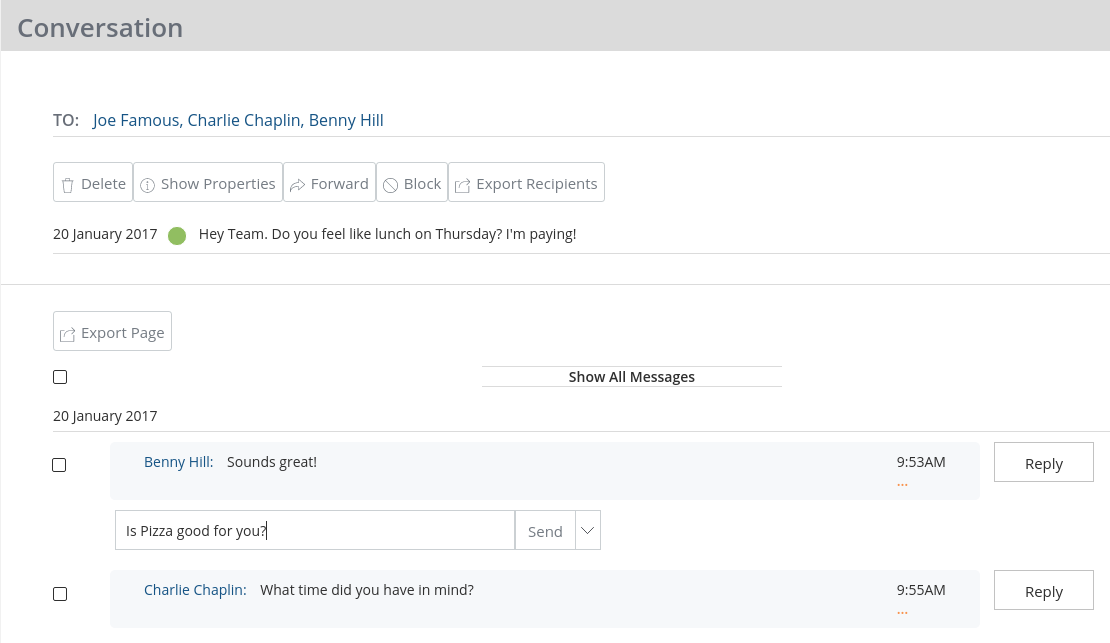 Normally Inbox, Sent Messages and All Messages only display messages sent or received by the current logged in user. However, it is possible to view messages sent or received by other users in the same company and reply to their incoming messages, as long as you switch on Enable Shared Messages when editing a User