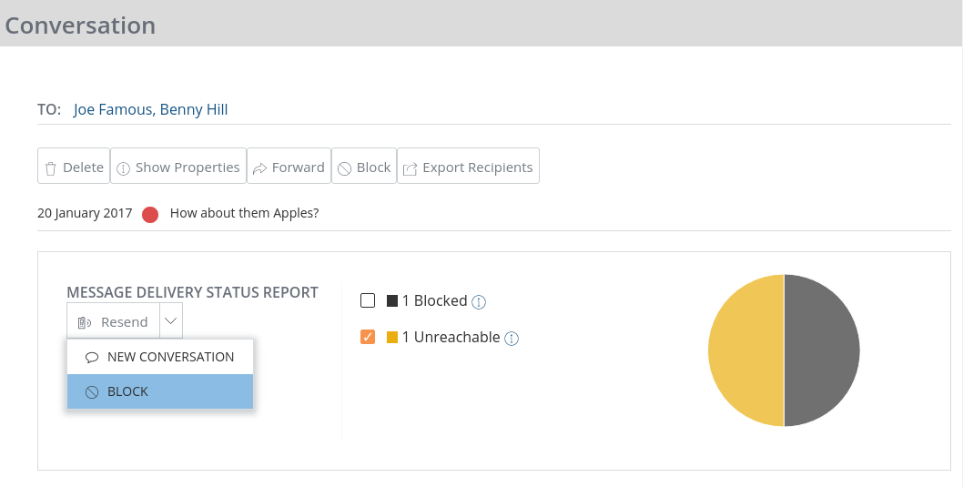 Clicking on the pie chart beside the message shows the delivery statuses of the message.