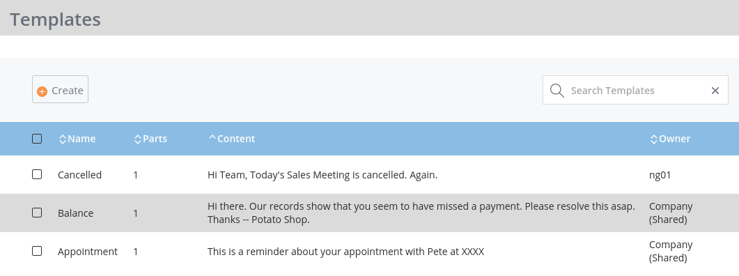 Templates can be named so they are easily recognised in the template list when creating a message. If your profile allows it, templates can be up to three SMS parts (about 459 ASCII characters, or if the message contains any non latin characters then the max is 201).