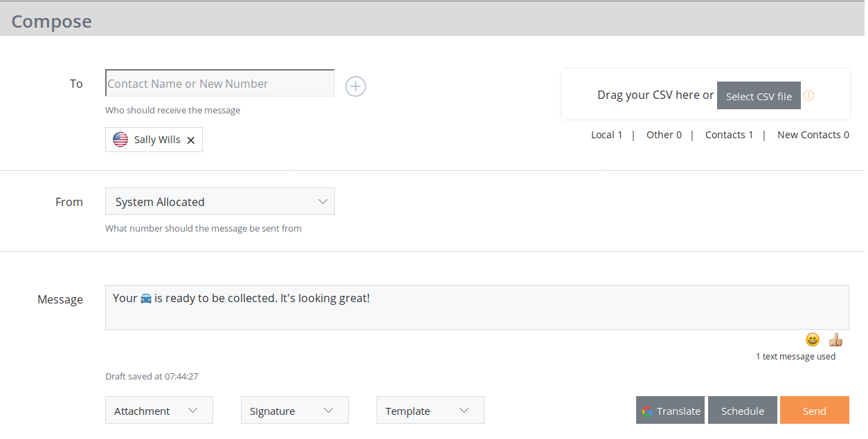 Once you have mastered sending a single message you can even import a list of numbers from Microsoft Excel using our Bulk Uploader functionality. You can also Schedule messages, Attach files or links to websites, use Templates and even use the Contacts and Groups from your Address Books. The recipient list allows a comma, space or semi-colon separated, list of numbers or Contacts from your Address Book.